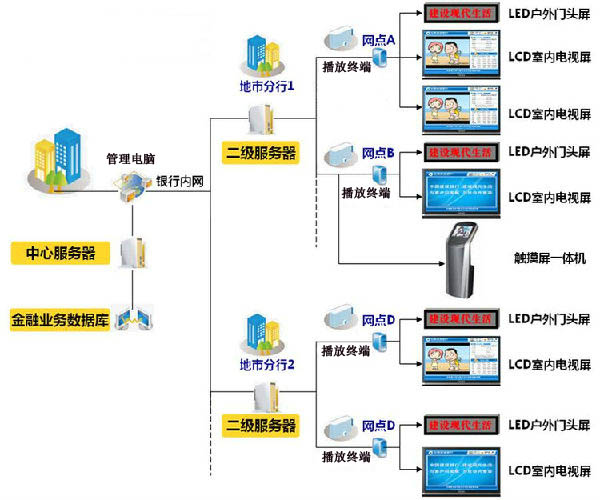 日益活躍的金融市場(chǎng)和不斷增多的業(yè)務(wù)種類不僅給金融業(yè)帶來了大跨步發(fā)展的良機(jī),更給銀行多媒體信息發(fā)布和金融信息發(fā)布的規(guī)范化提出了新的課題。最豐富、最快捷的信息帶來的是最高的效率和最大的收益,這樣銀行多媒體信息發(fā)布系統(tǒng)的信息含量、傳播效率也就日漸重要起來。現(xiàn)有的銀行信息發(fā)布系統(tǒng)大多采用LED電子顯示屏的模式,只能通過簡(jiǎn)單的字幕發(fā)布利率、外匯牌價(jià)這樣一些基本的金融信息,信息含量少,隨著科技進(jìn)步以液晶廣告機(jī)為代表的數(shù)字標(biāo)牌顯示終端性能也不斷提高。