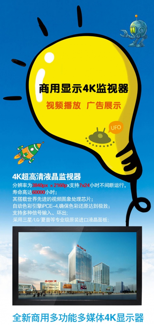 65寸4K超高清液晶監(jiān)視器,分辨率為3840px ×2160px,采用國際知名品牌液晶面板(如:LG、三星、夏普等),支持全天候7x24小時運行,支持紅外遙控與RS232拓展控制。
