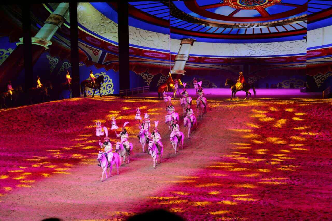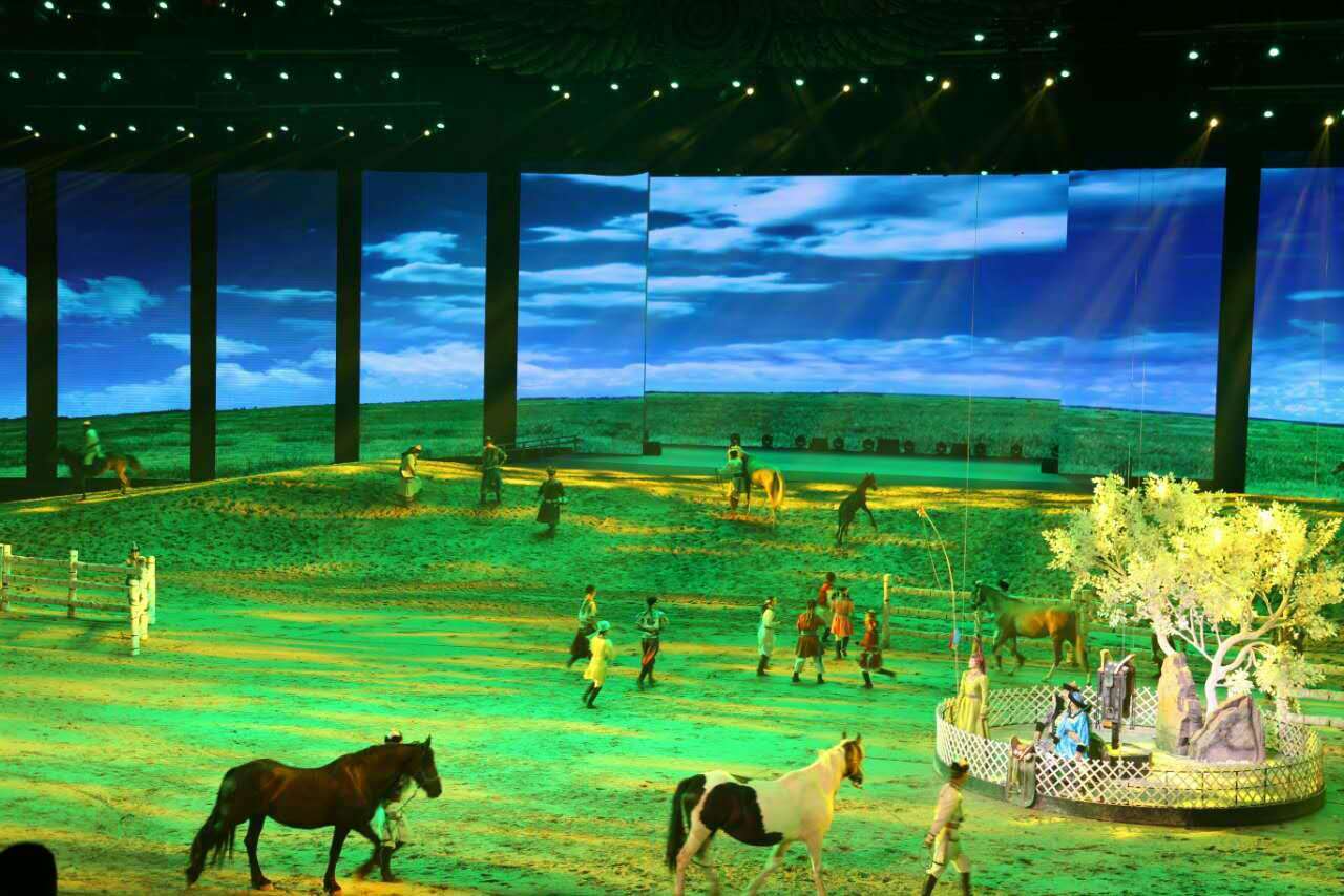 《千古馬頌》劇目演出以蒙古族歌、舞、樂、雜技等藝術(shù)元素,融合高科技聲光電及全息影像投影技術(shù),以全新藝術(shù)形式演繹了馬背家園的溫情,百駿出征的壯觀,草原兒女的情愫,千古馬頌的絕唱!將人與馬的情緣演繹的淋漓盡致,唯美震撼……我公司在此次演出項目上采用Barco6臺2K40通過拼接及融合的技術(shù)實(shí)現(xiàn)了非常壯觀的視覺盛宴。