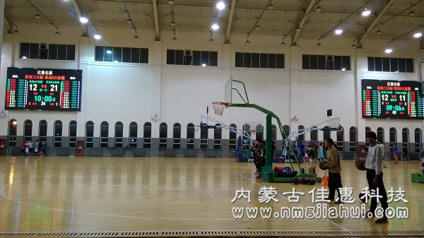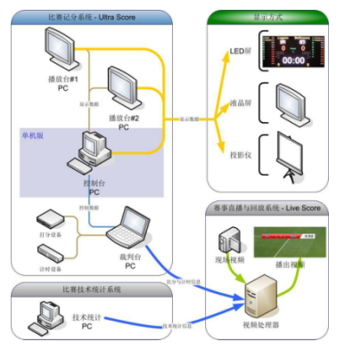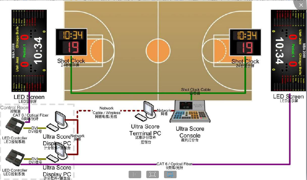 體育館兩邊安裝兩塊LED顯示屏,兩塊屏后的控制室內分別設立控制電腦,負責大屏的控制和顯示,大屏通過LED數據和控制電腦相連。場館內設立局域網,兩臺LED顯示屏控制電腦都連入網絡,同時比賽期間放于場邊的裁判操作電腦連入局域網,該電腦與籃球打分控制器相連接,比賽時裁判只需要在場邊進行打分。兩塊大屏可同時顯示相同信息,也可以各自分別顯示不同的內容。兩邊的籃球架上都安裝籃球24秒專用顯示屏,并用數據線連接到場邊的24秒控制臺上,比賽中可由專人負責進行比賽和24秒計時操作。24秒控制臺與場邊的裁判控制電腦可以使用數據線連接,則也可以使用軟件來控制24秒計時的顯示同時在場邊配置了一套籃球專用的犯規顯示器(單面顯示),用于顯示賽隊犯規次數。 一套籃球專用球權控制器(單面顯示),指示當前控球權的一方。在單獨的一臺電腦上安裝籃球比賽用軟件,用于統計賽程中球員的賽場表現情況。比分直播系統通過與體育場館比賽計分系統、籃球技術統計軟件進行通訊,在采集多路現場視頻信號的同時,對信號進行本地化的快速編輯處理,實現現場實時比分疊加、球員信息顯等視頻播放要求。賽場的多媒體綜合信息發布系統,與賽場計時記分系統聯動,用于在賽場周邊的屏幕上統一管理和發布球場相關的球賽得分信息、球員及裁判信息、廣告以及相關資訊、指引等。