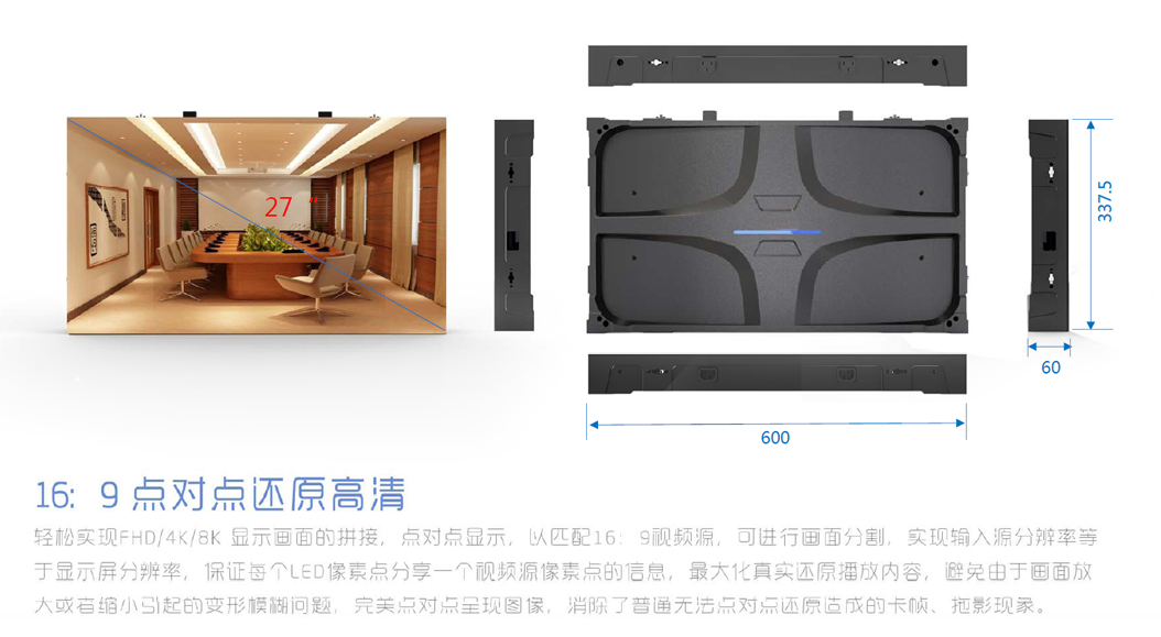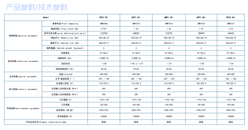 產品型號:JH-P0.9 模組尺寸:150*168.75 點間距:0.9mm 亮度:600-800 cd/m2